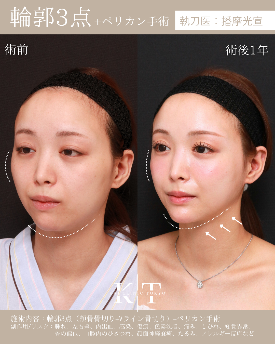 腫れ、左右差、内出血、感染、傷痕、色素沈着、痛み、しびれ、知覚異常、 骨の偏位、口腔内のひきつれ、顔面神経麻痺、たるみ、アレルギー反応など