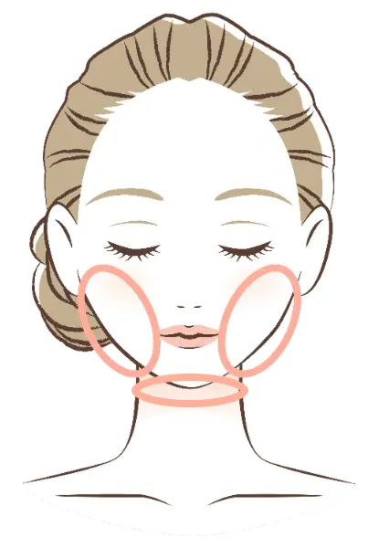 当院での施術対応部位:頬(ジョールファット)・メーラーファット(法令線)・あご下・二の腕・肩・脇肉