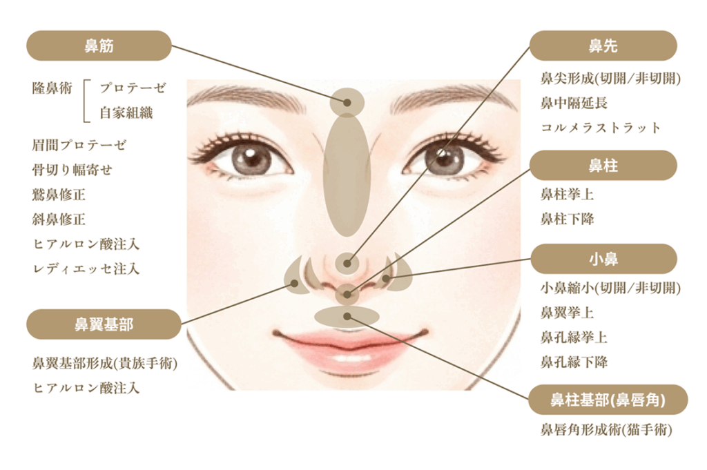 お顔の中心に位置する「鼻」は、全体の印象を大きく左右する重要なパーツです。鼻に関するお悩みは、高さ・長さ・太さ・大きさといった形状に関するものが多いですが、実は 目や口、輪郭とのバランス こそが、美しさを決める大切なポイントとなります。当院では、形成外科専門医 が一人ひとりのお顔全体の調和を考えながら、自然で美しい鼻のデザインを提案し、理想の仕上がりへと導きます。