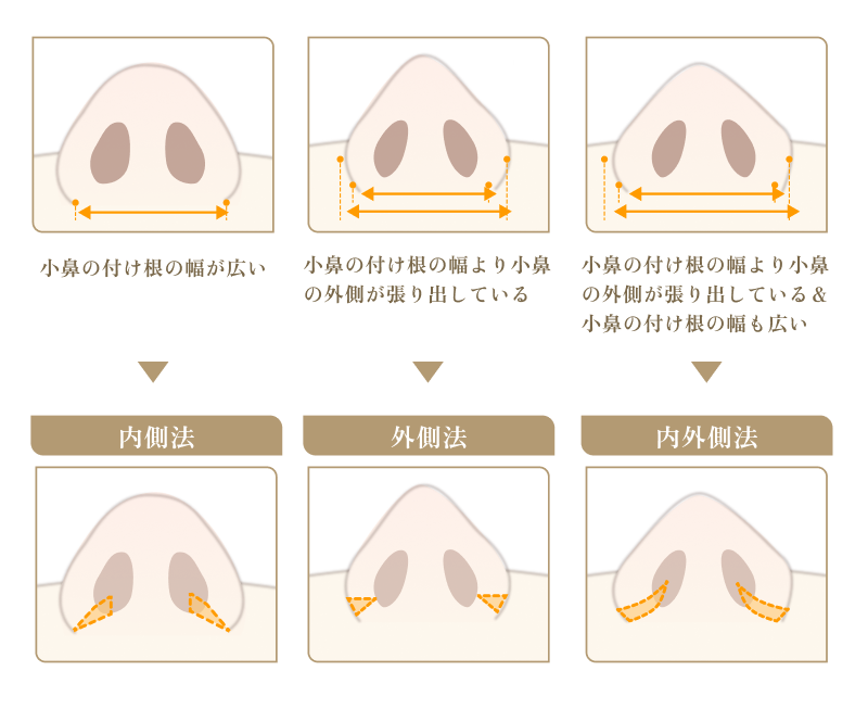傷が目立ちにくいのは内側法ですが、外側や内外側法を選んだほうがいい場合もあります。具体的には、 ・小鼻の付け根の幅より小鼻の外側が張り出している場合は、外側法。 ・すそ野が広い場合は内側法。 ・どちらもの場合は内外側法です。