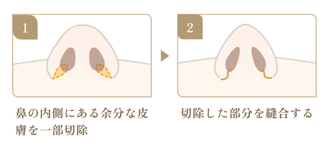 鼻の穴の内側を切除する方法です。鼻の穴の内側を一部切り取って縫い合わせ、鼻の開きを小さくします。傷が外から見えないのが大きなメリット。
