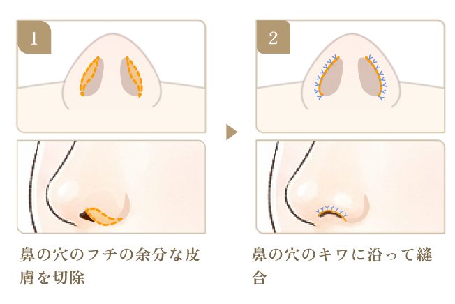 皮膚にデザインをマーキングして、垂れている鼻の穴の一部を切除。皮膚を縫合して形を整え、手術完了となります。